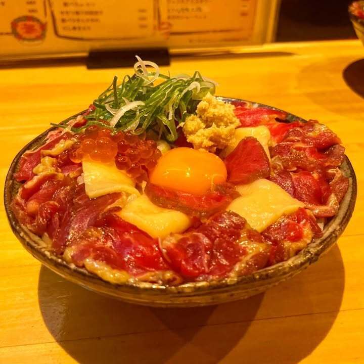 新鮮な熊本の馬刺し(カルビ、タテガミ、赤身)をたっぷり使用。相性抜群のいくらも添えて。
