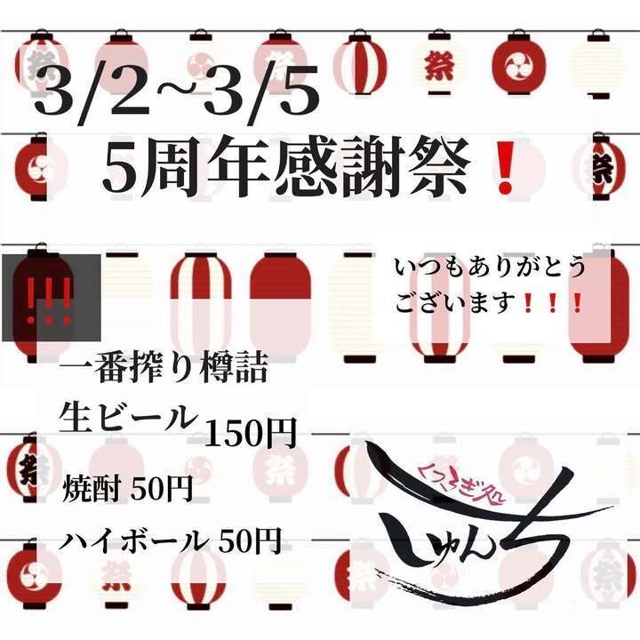 #名古屋#大須#居酒屋#感謝祭#いつもありがとうございます#しゅんち#5周年#生ビール150円#ハイボール50円#焼酎50円#楽しみましょう